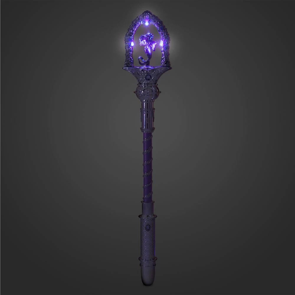 A wave of Ariel’s wand commands a kingdom of enchantment. Topped by the princess’ sculpted figure, this silvery scepter lights up when you press a gem on the stem for a dreamy The Little Mermaid costume accessory.
