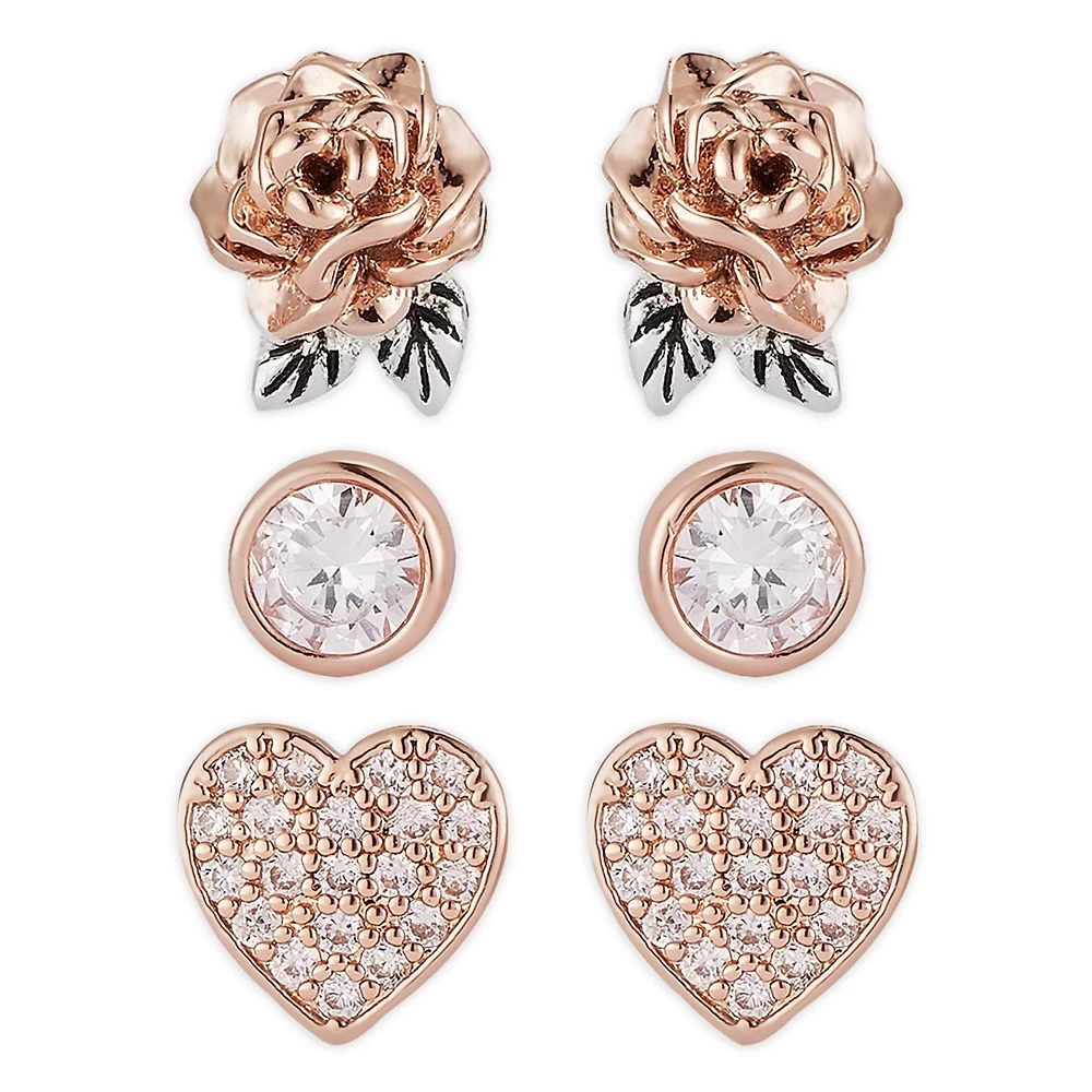 Mix and match fairytale style with this set of three different pairs of earrings inspired by Beauty and the Beast. The three rose gold tone designs include an earring pair of roses, a pair of mini round bezels, and a pair of hearts detailed with cubic zirconia.