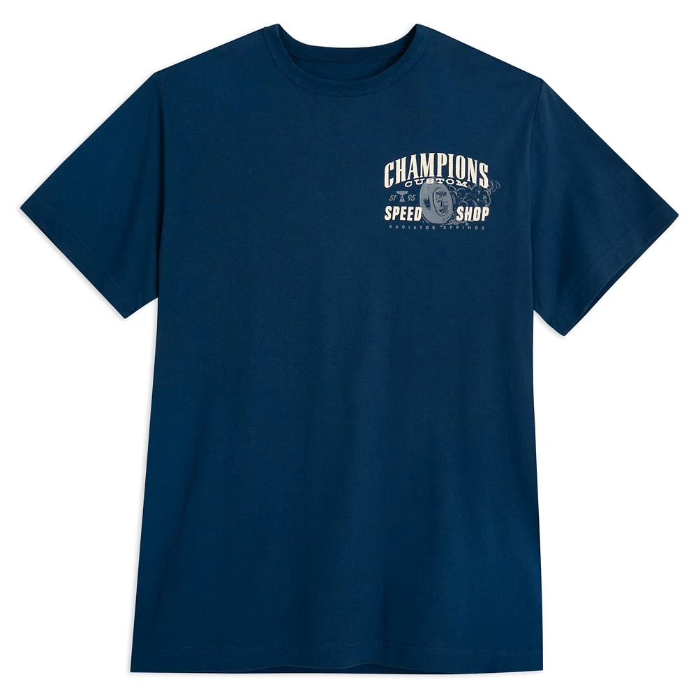 Fans of the ”Fabulous Hudson Hornet” will be revved up by this t-shirt inspired by Disney and Pixar’s Cars. Doc Hudson, the crew chief of Lightning McQueen’s team, is featured in his racing days on the back of this cotton tee that promotes the ”Champions Custom Speed Shop” on the front.