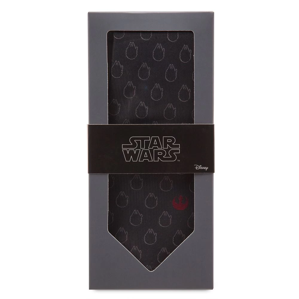 Feel the Force of fine fashion at your next formal event with this silk Star Wars necktie featuring a Millennium Falcon silhouette pattern and Rebel Alliance Starbird accent.