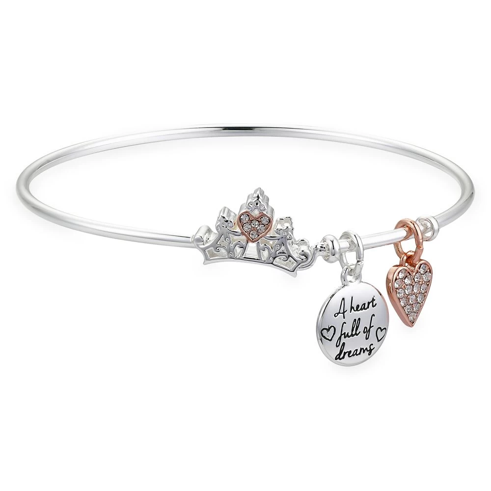 Love is at hand for the true romantic with this Disney Princess catch bangle featuring a sparkling crown and two charms to emphasize the theme. A silvertone round charm is etched with ”A heart full of dreams” and a rose goldtone heart is encrusted with sparkling cubic zirconia.
