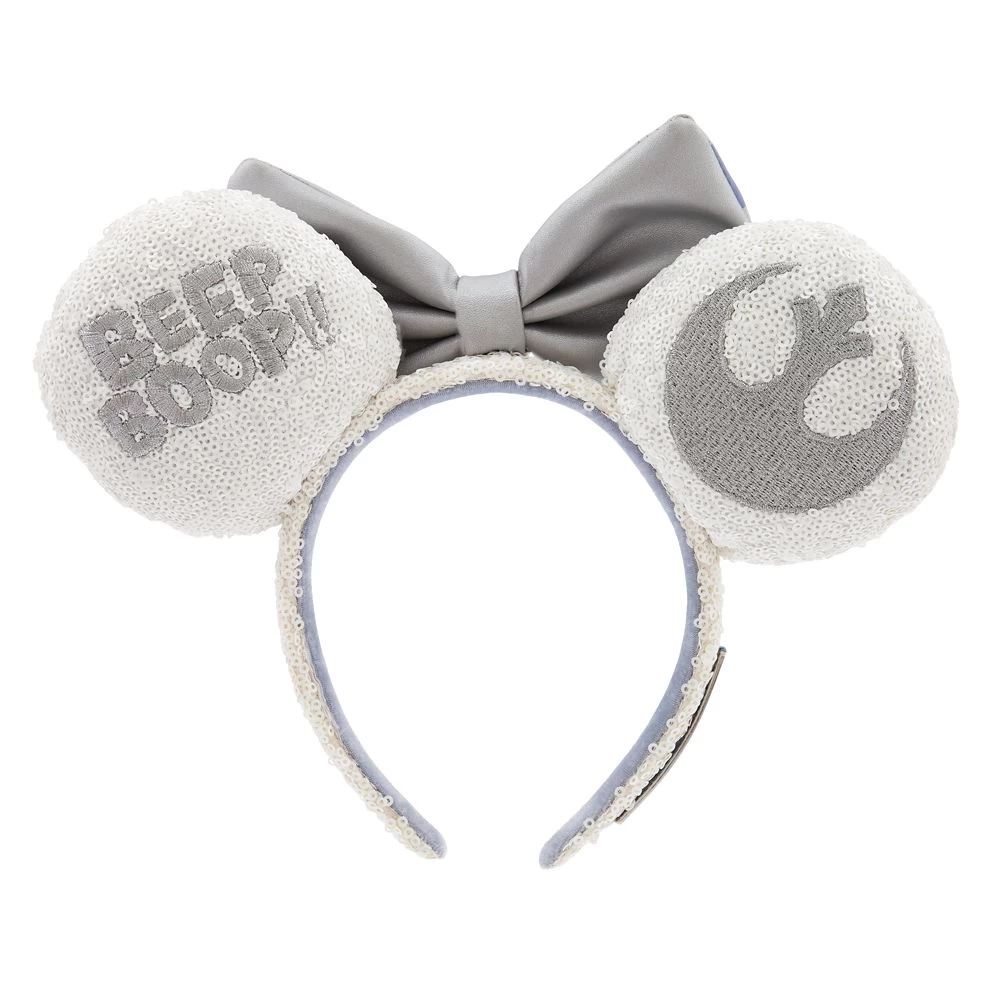 Never lost for beeps! and boops! the spirited R2-D2 provides the inspiration for this ear headband from Loungefly. The bow features embroidered detailing of the Astromech droid’s distinctive design while the padded ears are covered in white sequins. The rebel alliance symbol is embroidered on the back, plus there’s a message from Artoo for those behind you.