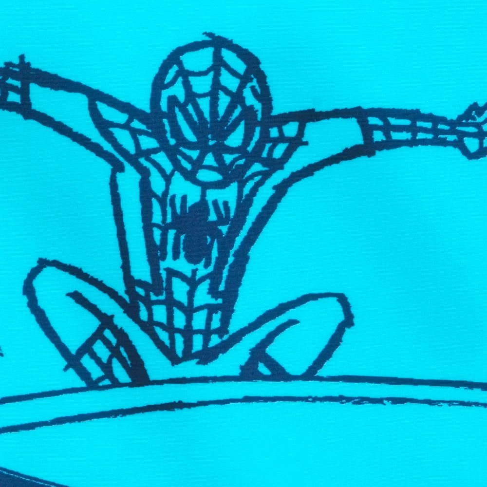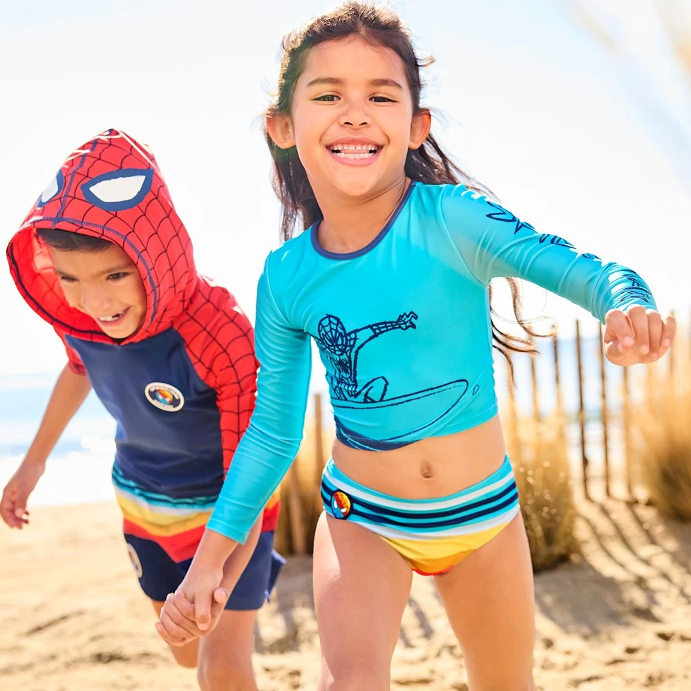 Instead of surfing the web, Spider-Man surfs the ocean waves on this swimsuit. The Super Hero is pictured catching a wave to relax after a tough day saving the world. This two-piece swimwear includes a long sleeve top and coordinating bottoms with bright bands of color so they’ll be all set to swing down to the beach or pool.
