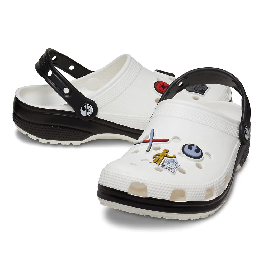 Show your allegiance to the Force and to the Star Wars saga with these clogs by Crocs. With their black and white design, they are both on the light side and the dark side. It’s a theme that extends to the molded vinyl fixed charms which include the Rebel Alliance and Galactic Empire symbols.